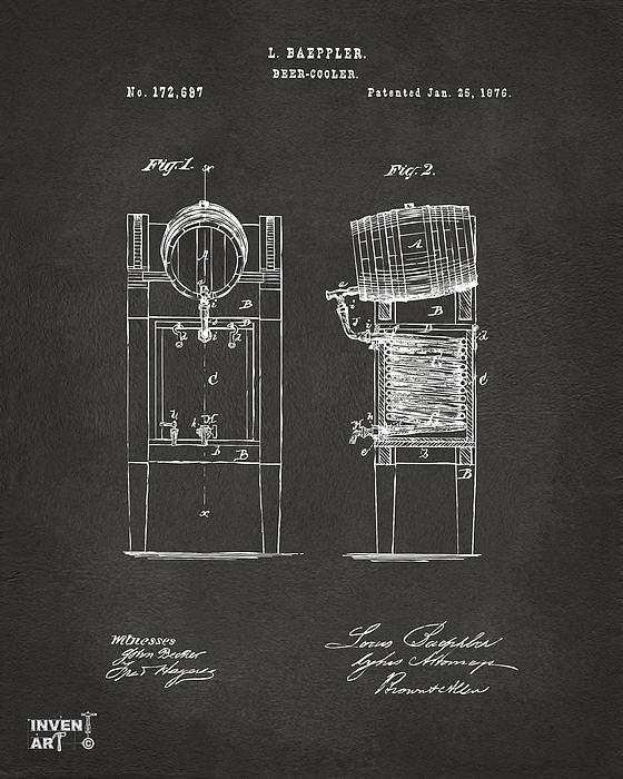 This artwork series is based upon vintage US patent drawings of ingenious and notable inventions, in this case, an 1876 Beer-Cooler patent for cooling kegs. This is a fascinating piece of history for a beer or alcohol aficianado, and great decor for a bar or pub. (This patent artwork also available in a variety of styles.)