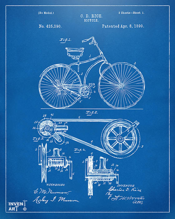 This artwork series is based upon vintage US patent drawings of ingenious and notable inventions, in this case, an 1890 Bicycle Patent. This is a fascinating piece of history for a bicyclist, and optimal for a bachelor looking for artwork with a masculine edge. (This patent artwork also available in a variety of styles.)