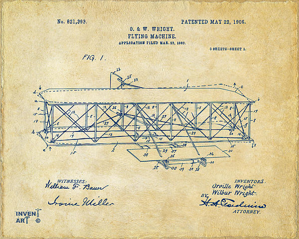 This artwork series is based upon vintage US patent drawings of ingenious and notable inventions, in this case, a 1906 Wright Brothers Flying Machine patent. For pilots and history buffs, this distinctive artwork takes flight. (This patent artwork is available in a variety of styles.)