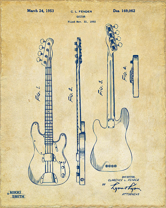 This artwork series is based upon vintage US patent drawings of ingenious and notable inventions, in this case, a 1953 Fender Bas Guitar Patent. This artwork is a perfect gift for a musician or music lover! (This patent artwork also available in a variety of styles.)