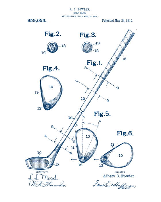 This artwork depicts a vintage 1910 golf club patent, a perfect gift for a golfer! This artwork would look great in an office, den or man-cave. If you love golfing, a set of related golf patent artwork (golf club, golf ball, golf tee) would make perfect decor. (Also available in a blueprint illustration style.)